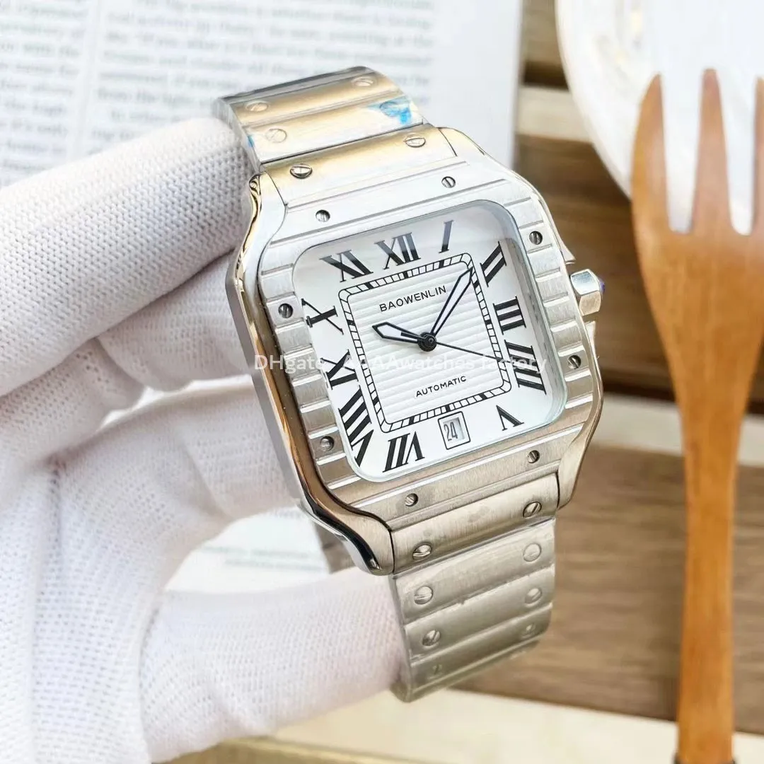 Cette montre-bracelet arbore un design luxueux et élégant, inspiré du style emblématique des montres Cartier Santos. Elle possède un boîtier en acier inoxydable avec une forme carrée aux angles arrondis, agrémenté de vis apparentes sur la lunette et le bracelet, renforçant son allure industrielle sophistiquée.